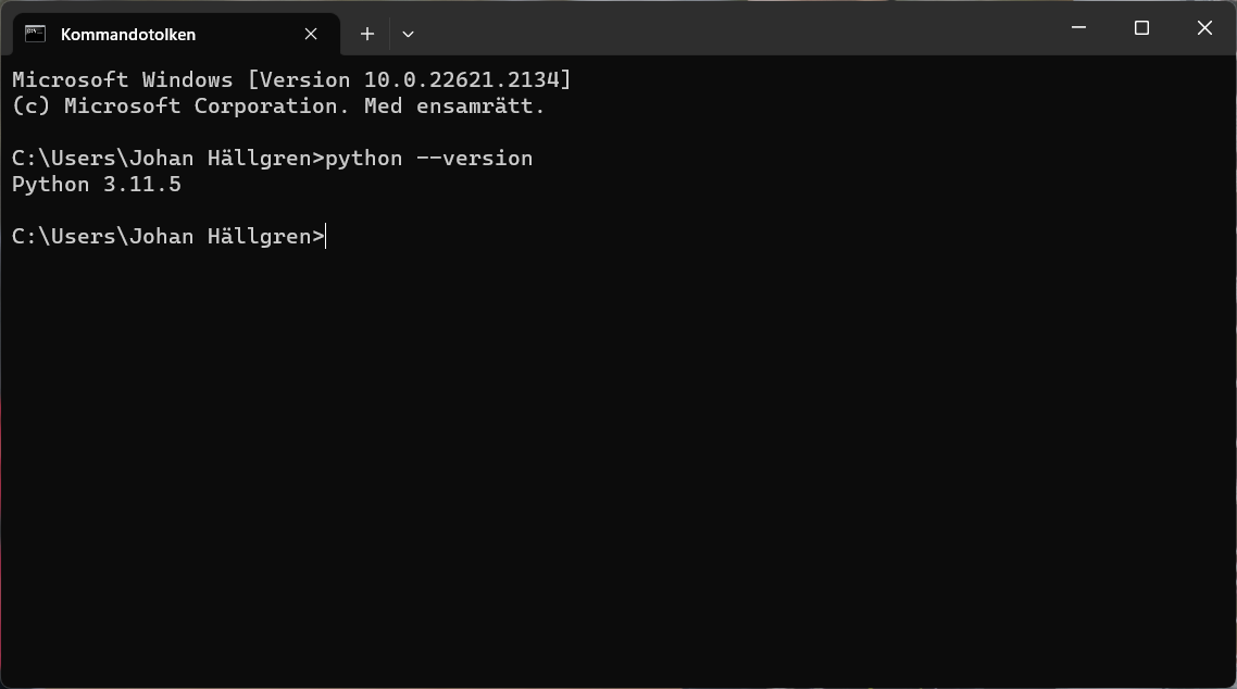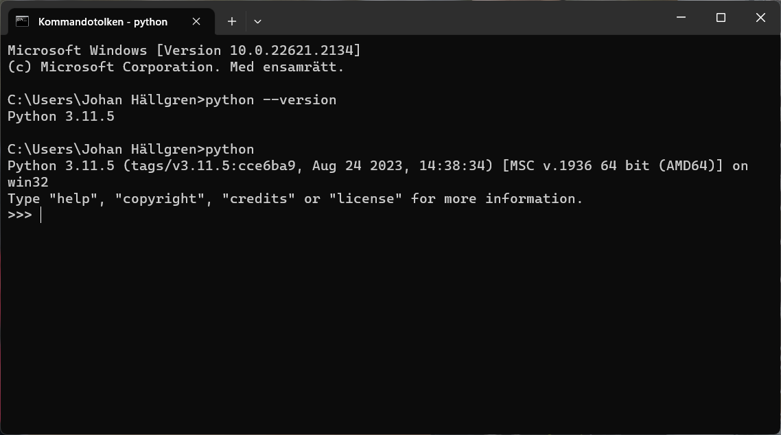 Vi börjar med att kolla att Python har installerats korrekt och vilken version som är aktuell. Skriv python --version