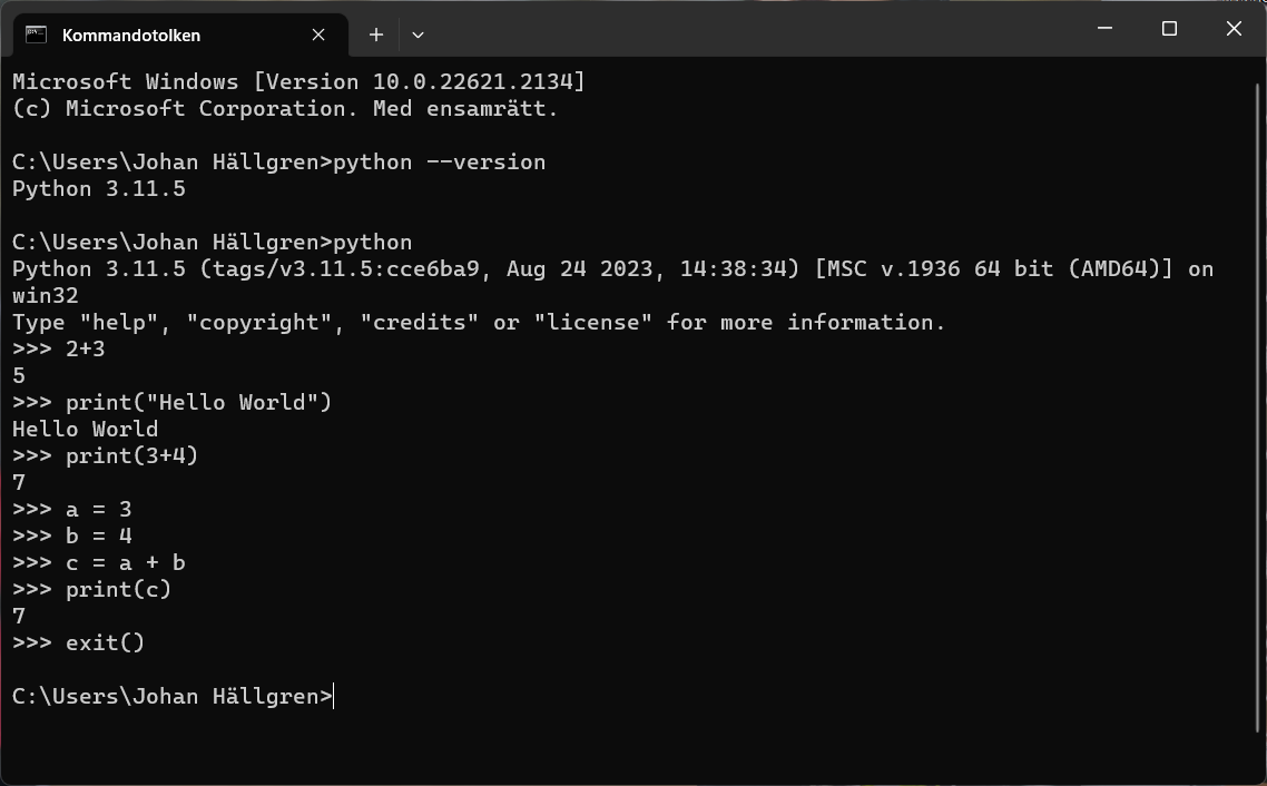 Du har nu skrivit dina första programmeringsinstruktioner till Pythons interpretator och resultatet bör bli likadant som i min bild.