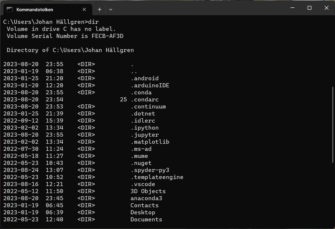 och på svenska kan vi också säga katalog. Skriv kommandot dir