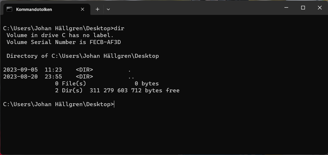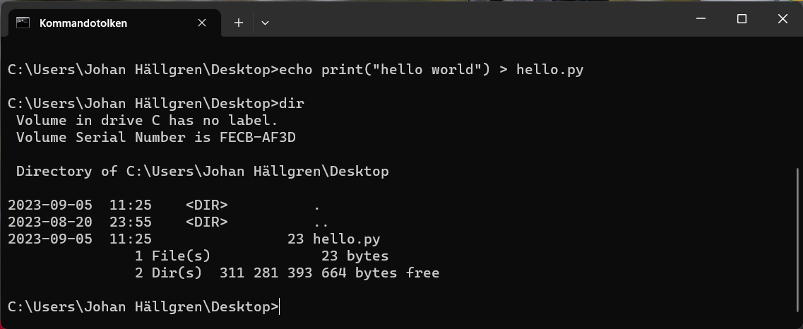 Du får ingen information om att filen har skapats, är du osäker att det har fungerat så skriv kommandot dir