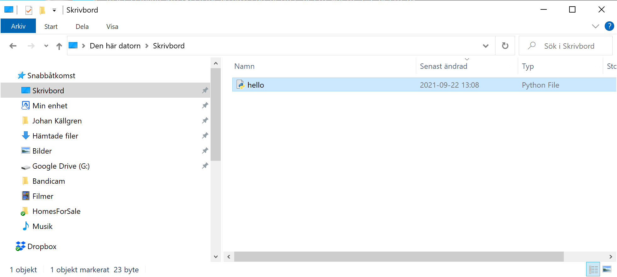 Kanon, filen ligger på rätt plats. Gå nu till Utforskaren / Skrivbord (här kan det bli lite trixigt med både svenska och engelska namn för samma mapp) och leta upp den fil som du skapade i mappen Desktop