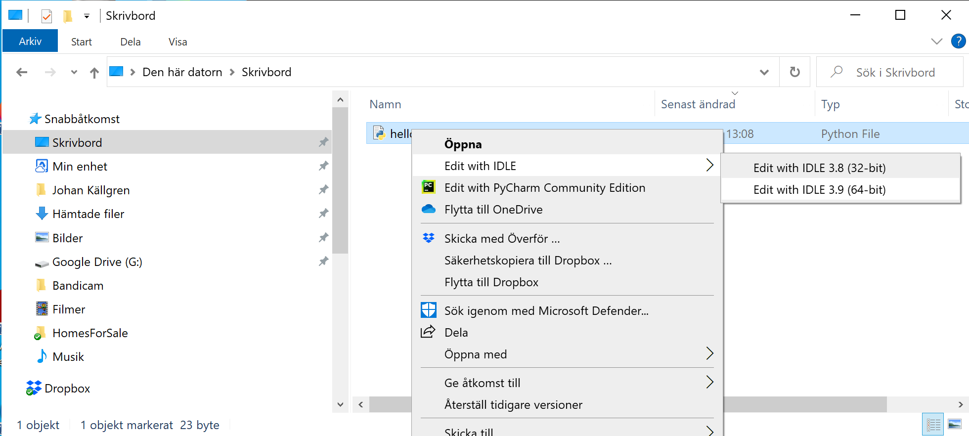 Om du vill kika på innehållet i den filen som är skapad så kan du högerklicka på filen och välja att öppna den med IDLE (om den är installerad).