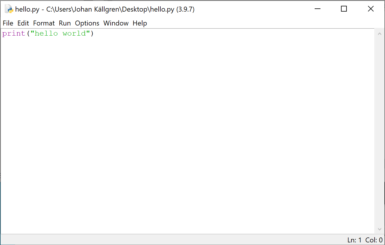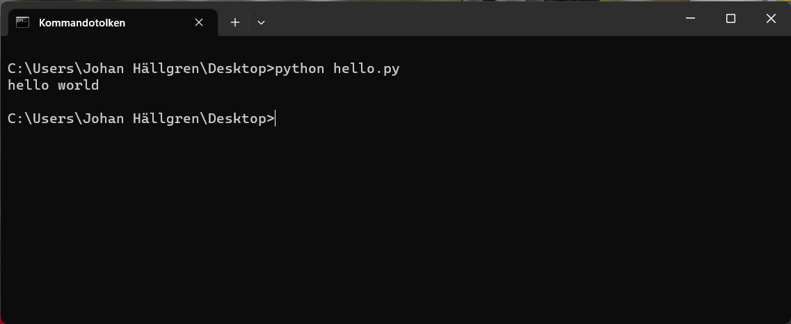 Bra. Nu kan vi testa att köra filen från terminalen. Med kommandot python hello.py