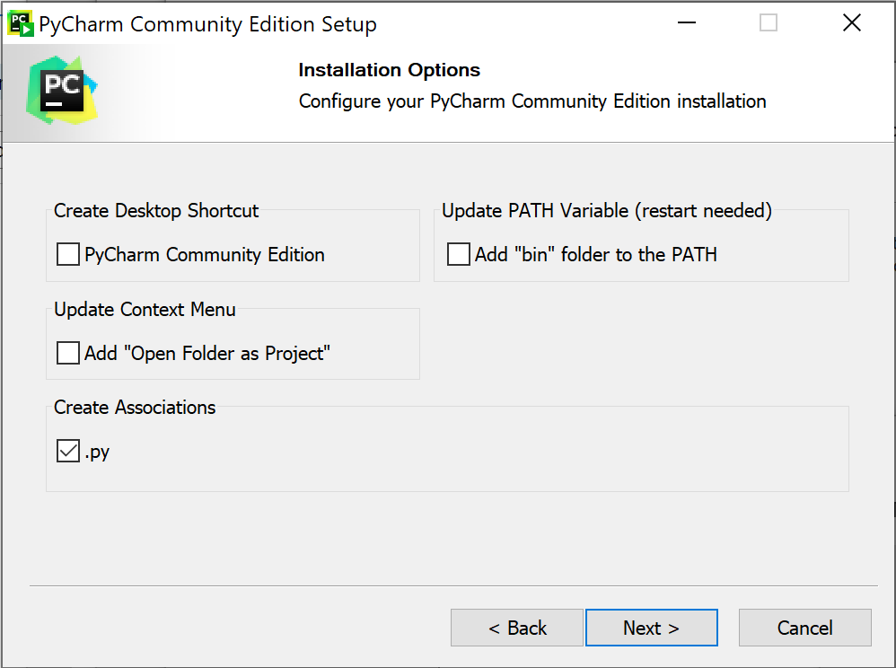 som du finner en bit ner på sidan. Kör sedan installationsfilen och gå igenom installationen. Det enda beslut du behöver ta är egentligen bilden nedan, där du får några inställningar du kan göra om du vill. Det enda jag gjorde var att skapa koppling mellan .py