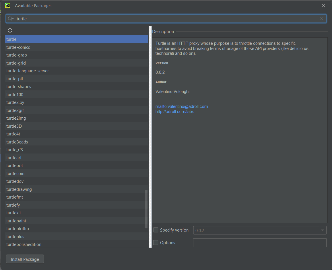 Sök sedan efter det paket du vill installera och se till att du väljer rätt variant och version av paketet. I detta fallet så installerar jag Turtle