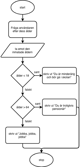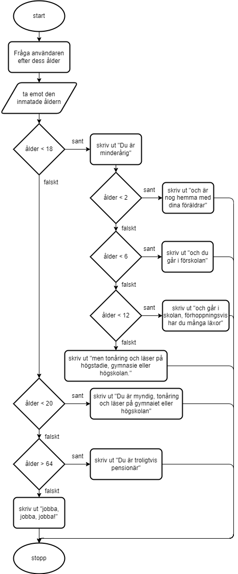 Startblocket behöver väl ingen större beskrivning och sedan kommer det ett block där användaren får information om att hens ålder skall matas in. Detta följs av ett inputblock där användaren faktiskt matar in åldern. Sedan börjar processen där vi gör våra jämförelser, först kollar vi om åldern är mindre än 18, om den är det så skriver vi ut ett meddelande. Är åldern inte mindre än 18 så gör vi en ny jämförelse, denna gången om åldern är större än 64, om den är det så skriver vi ut ett annat meddelande och den inte är det så skriver vi ut ett tredje meddelande. Efter vald utskrift så avslutas programmet. I vårt exempel så har vi inte/kan vi inte berätta för den som skall koda programmet om vi vill ha en selektion bestående av if/elif/else eller om lösningen görs med if + if/else för hur lösningen sedan kodas det är inte upp till oss att avgöra. Det beslutet måste kodaren få göra baserad på sin kunskap och vilka eventuella begränsningar/features som finns i det programmeringsspråk där lösningen skall göras. |
