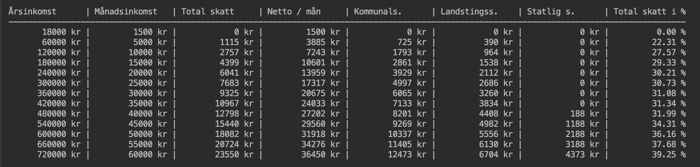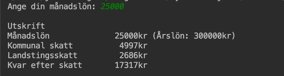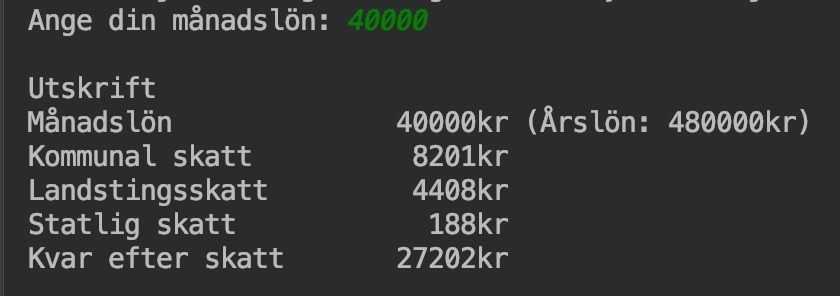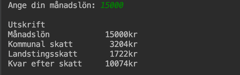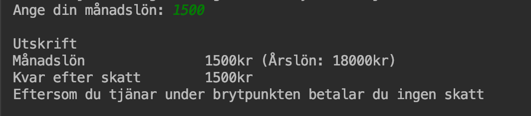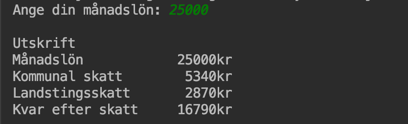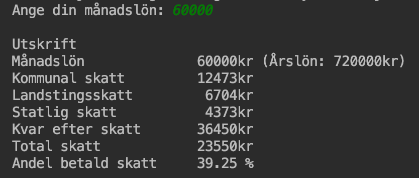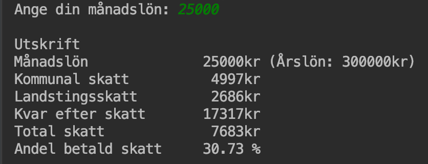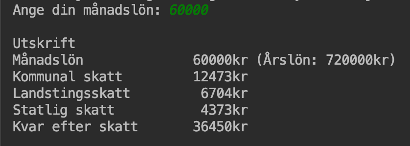 Dags för uppgiften. Jag vill att du skapar en tuple där det finns ett antal månadsbruttolöner där du skall beräkna skatten enligt de tidigare uppgifterna. Du behöver bygga om dina tidigare uppgifter ganska så rejält, så se till att du har säkerhetskopierat.