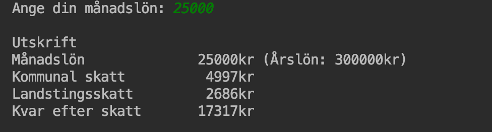 Fråga efter en löntagarens bruttolön i hela kr och skriv ut denna. Beräkna sedan hur mycket löntagaren skall betala i kommunalskatt och landstingsskatt och skriv sedan ut vad löntagaren får kvar efter skatt, samt betalar i kommunal- och landstingsskatt per månad.
